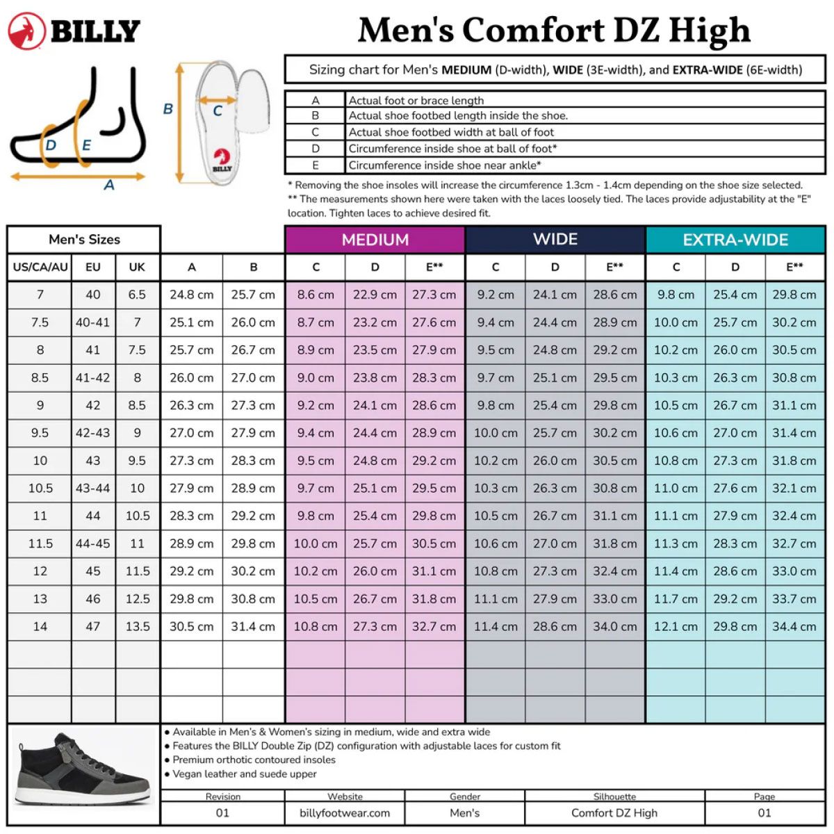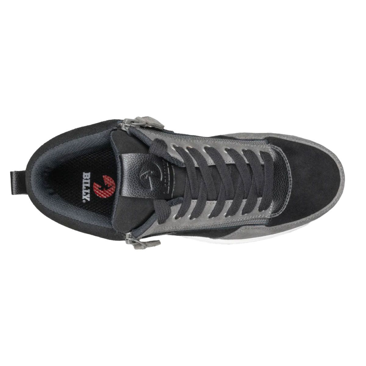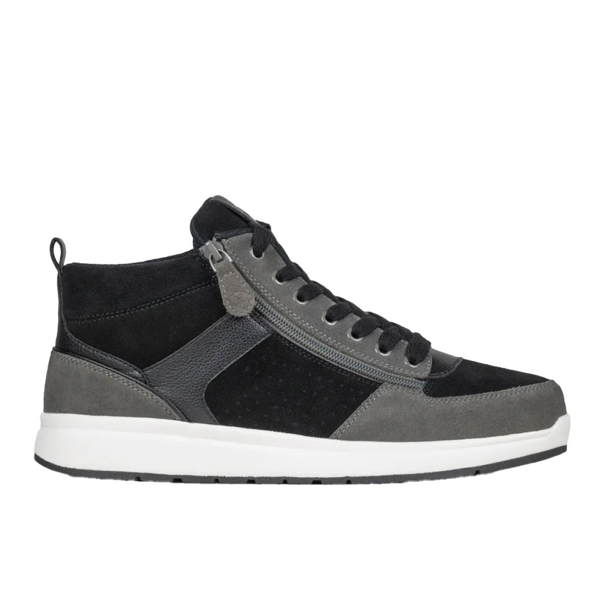 Billy Black/Charcoal/Black Comfort DZ High Zapatos Combina un estilo contemporáneo con comodidad funcional. Confeccionado en cuero vegano y ante con un elegante contraste entre negro y gris carbón. Gracias a la exclusiva cremallera doble tanto en el interior como en el exterior, el calzado se abre ampliamente como una zapatilla alta, lo que permite ponérselo y quitárselo sin esfuerzo, sin perder seguridad. El zapato cuenta con una plantilla moldeada extraíble para mayor sujeción, una entresuela que absorbe los impactos y una suela de goma duradera para un agarre óptimo. Disponible en tres anchuras para un ajuste perfecto.