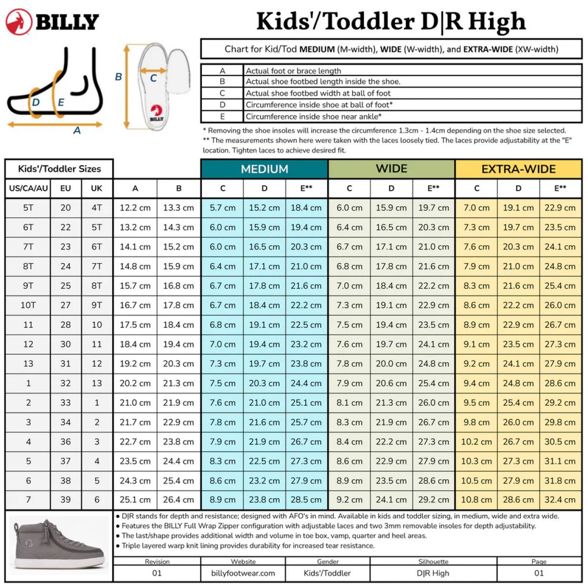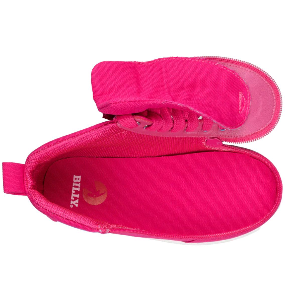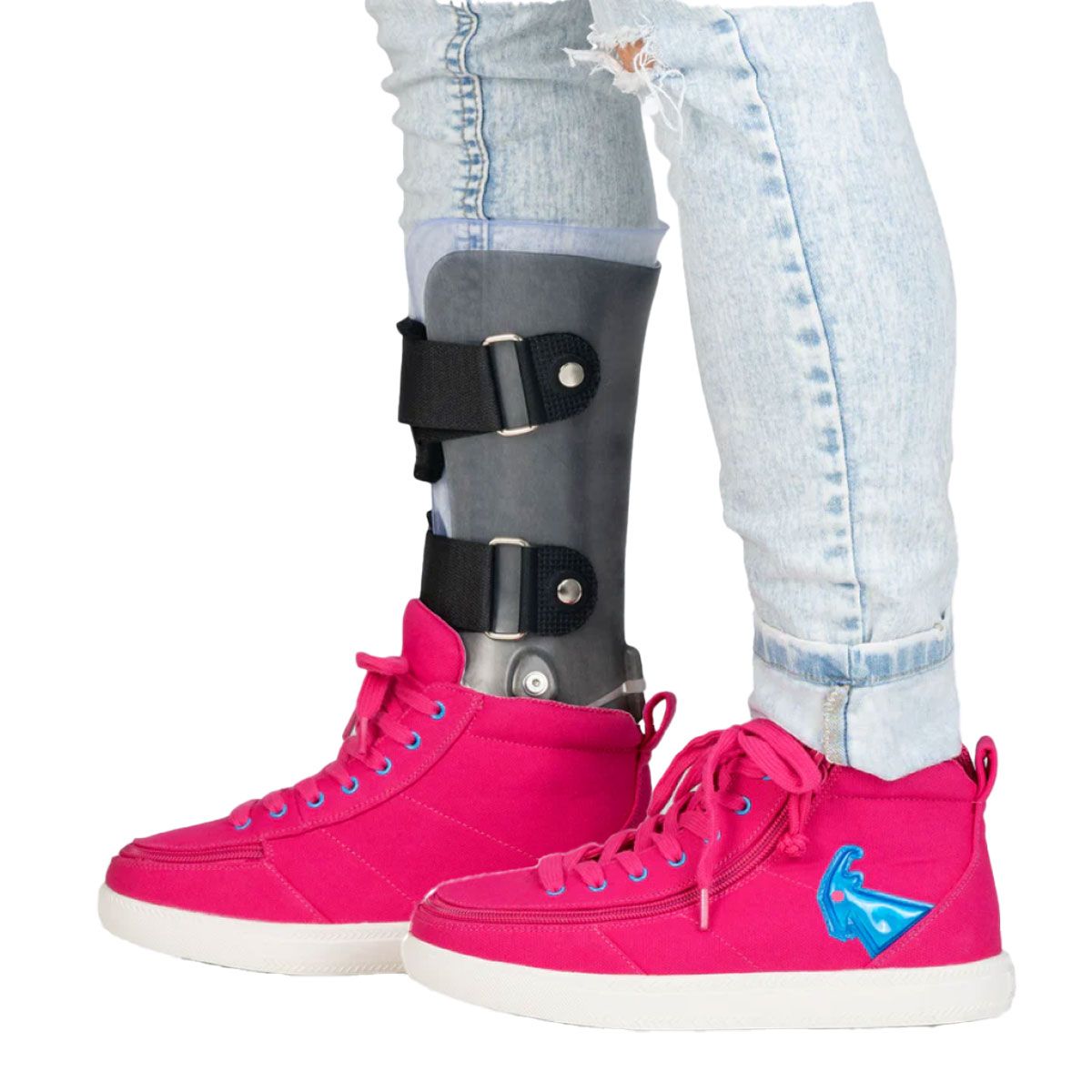 Billy Pink/Blue Light Ups Classic D|R High Tops Zapatos Juega, ilumina, repite. Los zapatos infantiles BILLY Classic D|R High con luces rosa/azul combinan luces alegres con la facilidad de uso de los niños. Fabricados en lona con un forro de punto resistente para mayor comodidad a cada paso. Su cremallera envolvente facilita su colocación y extracción, con cordones para un ajuste óptimo. Incluyen dos plantillas extraíbles (3 mm cada una), ideales para ajustar la profundidad si usas una ortesis. Disponibles en ancho estándar (MDR) y ancho (WDR). Las luces se activan automáticamente con el movimiento.